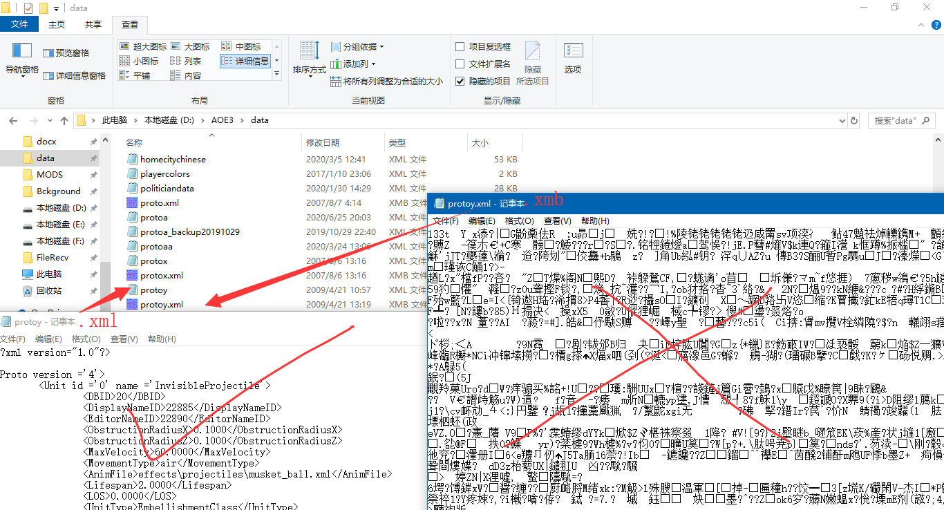 留意一下前面的xml是不是没有后缀名,因为你的系统隐藏了后缀名,所以实际上你打开的.xml.xmb文件,xmb是神话时代与帝国时代3用来加密xml文件的格式,所以你打开xmb文件就是乱码的。正确的作法是打开没有后缀名那个文件。