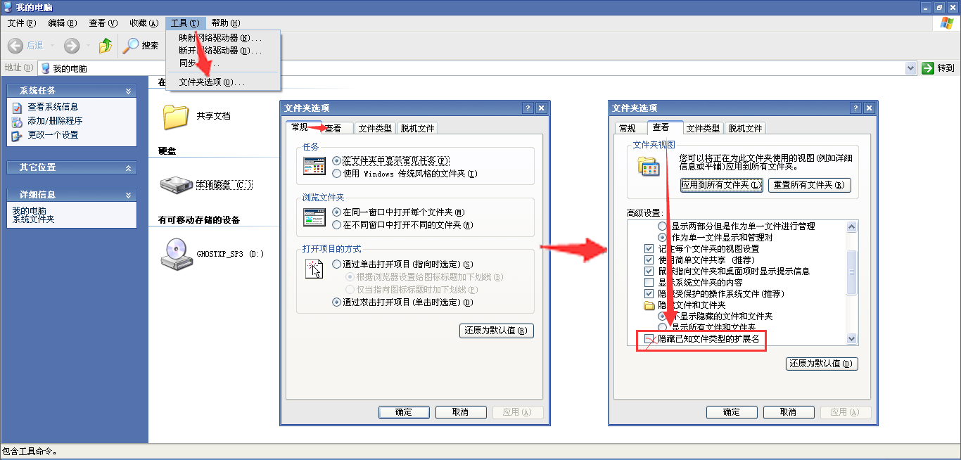 点击工具--文件夹选项;点击查看,把隐藏已知类型文件的扩展名的√去掉。