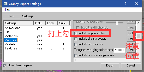 决定版使用的方法是 通过material文件进行法线赋予(material见后文第三章) 要求在导出模型时勾选上Include tangent vectors(Include binomal vectors也可勾选)【即前文所述勾选的地方】 这样读出来的法线也是没有黑白问题的