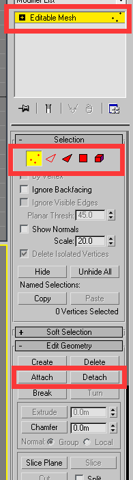 从上往下三个红框 需要像第一个红框里的这种可编辑网格或者多边形(mesh、poly)才有下面的几个框 如果是自己建的什么box啊teapot啊(圣典教程茶壶) 需要转换以后才能看见下面的选项(转换见1-4节末)